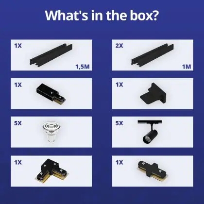 | Nome del fabbricante | Complete L shaped 1-Phase Track Set Black incl. 5x Spot fixture + GU10 2700K 3W Dim – 1,5 x 2 meter | |