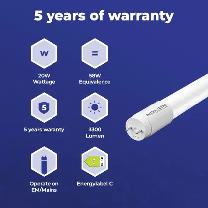 Il Noxion Tubo LED T8 Avant Extreme (EM/Mains) Ultra Output 20.6W 3300lm - 830 Luce Calda - | 150cm - Sostitutiva 58W è l’alternativa perfetta per il tubo fluorescente standard 58W nelle plafoniere con un reattore. Con questo tubo LED hai una garanzia di una vita media utile molto lunga e 5 anni Lampadadiretta.it di totale garanzia. .