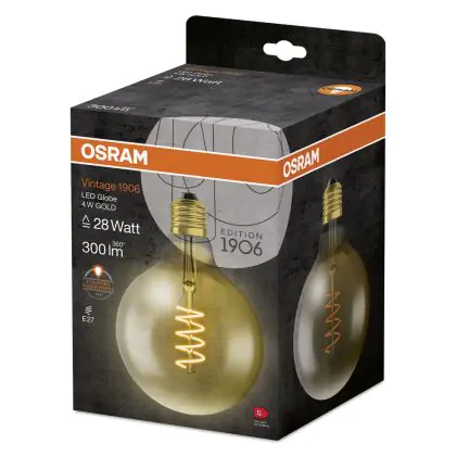 La Osram Vintage 1906 LED E27 Globe Filamento Oro 125mm 5W 250lm - 820 Bianco Molto Caldo | Sostitutiva 25W è la perfetta sostituzione per la tua lampada convenzionale 28W con attacco E27 grazie alla sua tecnologia LED. Passare a LED ti offrirà tanti vantaggi!